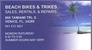 SarasotaLegacyTrail.com The Legacy Trail, Impressions by Sandy Estabrook Nearby Bike Rentals ÊSiesta Key Bike Kayak Big Bam Bikes - VENICE ÊBicycles International - VENICE ÊRide and Paddle - Siesta Key Friends of the Legacy trail The official folks in charge of the trail SW Corner of Clark & Beneva Beach Bikes & Trikes - Venice